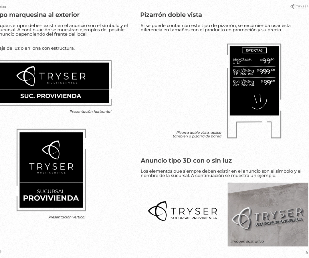 El trabajo no terminó con la identidad visual. White Rhino Studio también desarrolló manuales de franquicia, incluyendo un estudio detallado del tipo de locales que TRYSER podría operar. Nos entrevistamos con Protección Civil de Coahuila para garantizar que se cumplieran todas las medidas de seguridad necesarias, y estas se integraron en los manuales. Además, diseñamos el etiquetado para los productos en sus versiones de venta al por menor y al por mayor, asegurando coherencia y claridad en cada presentación.